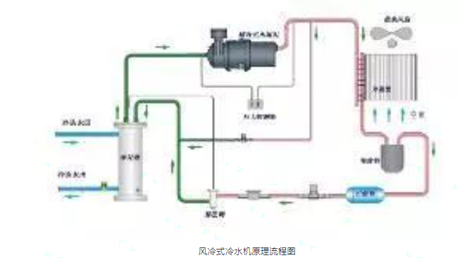 圖1-風(fēng)冷式冷水機(jī)原理流程圖: